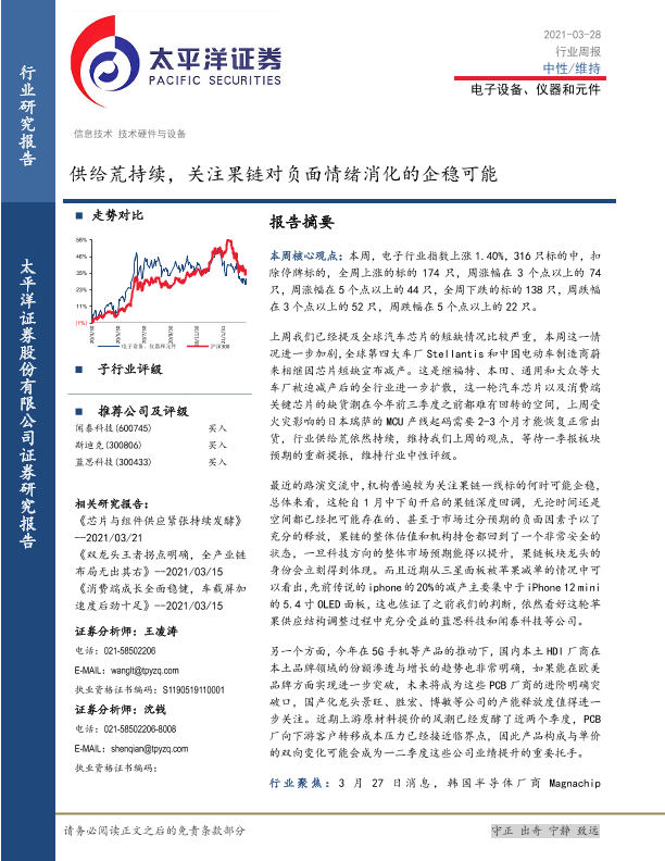 【太平洋证券】【20210328】电子设备、仪器和元件:供给荒持续,关注果链对负面情绪消化的企稳可能-14页