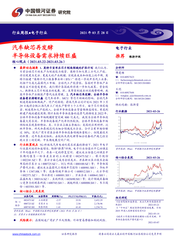 【银河证券】【20210328】电子行业周报:汽车缺芯再发酵 半导体设备需求持续旺盛-27页