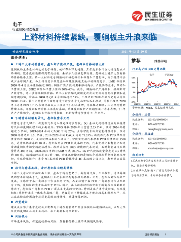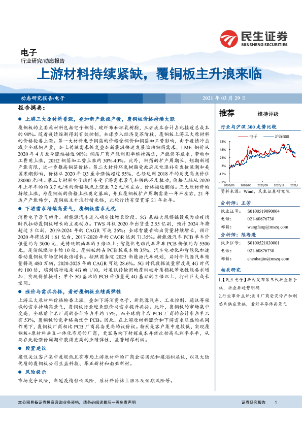 【民生证券】【20210329】20210329-民生证券-电子动态报告:上游材料持续紧缺,覆铜板主升浪来临-21页