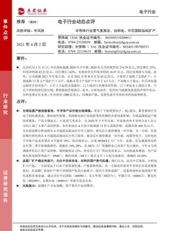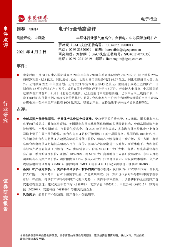 【东莞证券】【20210402】电子行业动态点评:半导体行业景气度高企,台积电、中芯国际加码扩产-2页