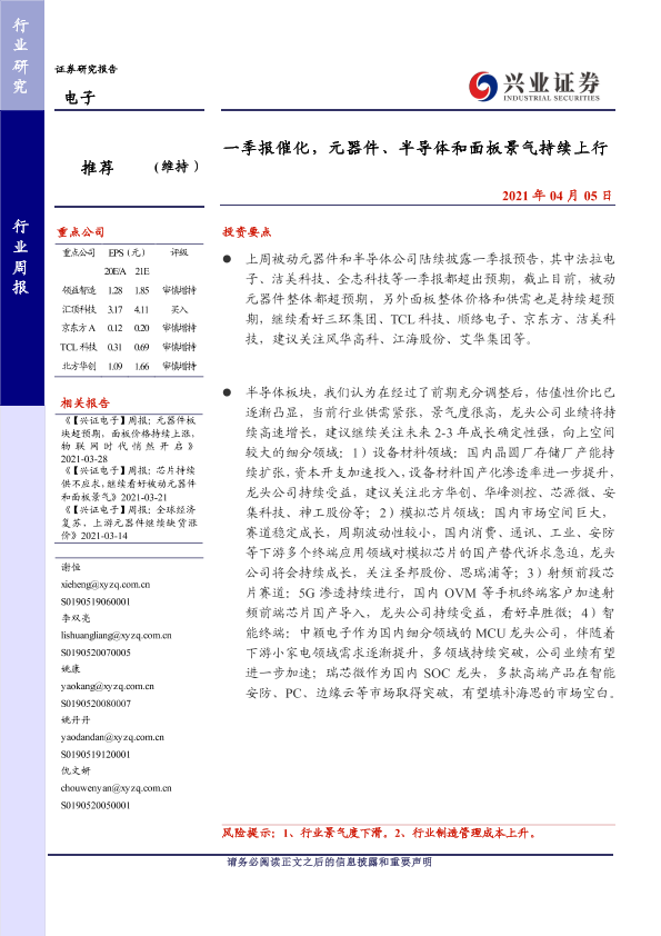 【兴业证券】【20210405】20210405-兴业证券-电子行业周报:一季报催化,元器件、半导体和面板景气持续上行-8页