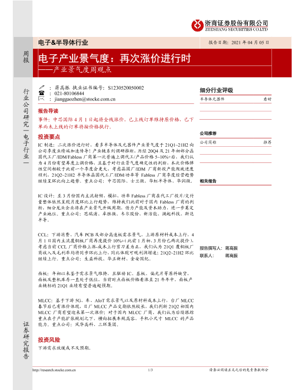 【浙商证券】【20210405】电子&半导体行业产业景气度周观点:电子产业景气度:再次涨价进行时-3页