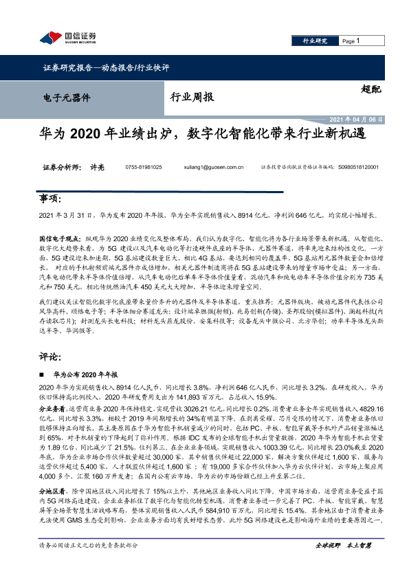 【国信证券】【20210406】电子元器件行业周报:华为2020年业绩出炉,数字化智能化带来行业新机遇-7页