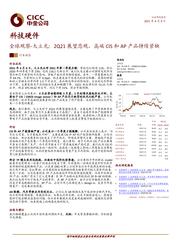 【中金公司】【20210409】科技硬件:全球观察-大立光:2Q21展望悲观,高端CIS和AP产品持续紧缺-7页