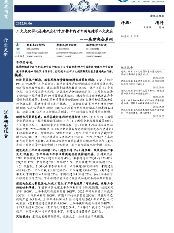 【国泰君安证券】【20220906】三大变化催化基建央企行情,首推新能源中国电建等八大央企-50页