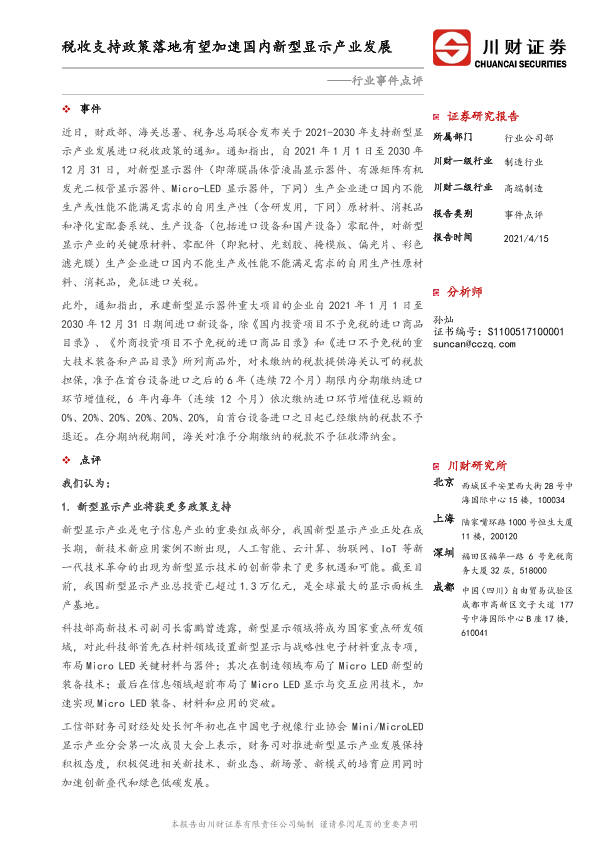 【川财证券】【20210415】高端制造行业事件点评:税收支持政策落地有望加速国内新型显示产业发展-3页