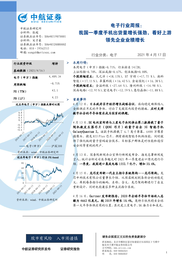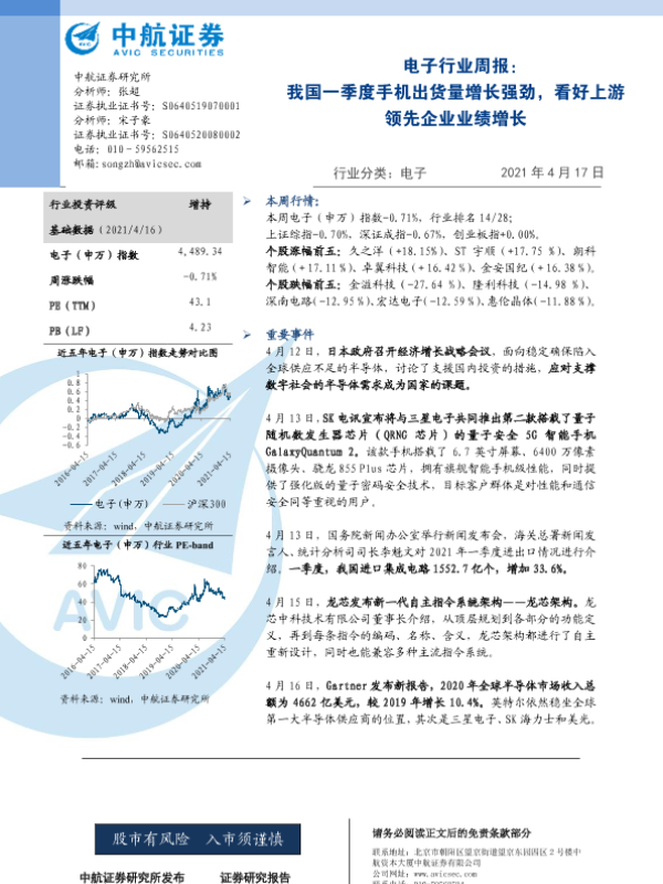【中航证券】【20210417】电子行业周报:我国一季度手机出货量增长强劲,看好上游领先企业业绩增长-5页