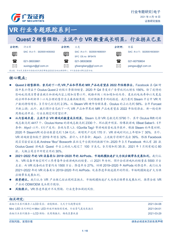 【广发证券】【20210418】VR行业专题跟踪系列一:Quest2销售强劲,主流平台VR数量成长明显,行业拐点已至-10页