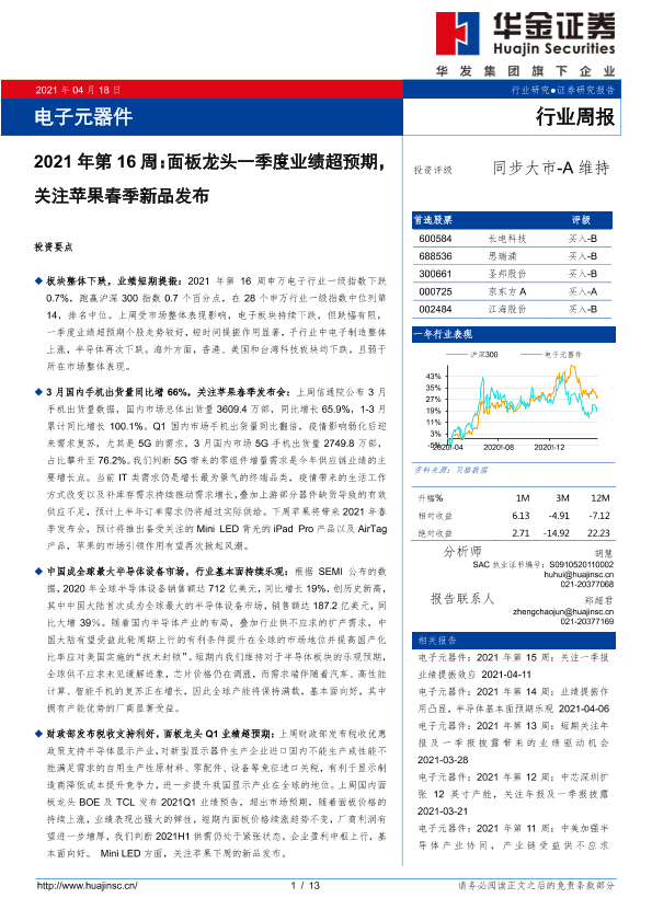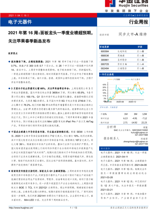 【华金证券】【20210418】电子元器件2021年第16周:面板龙头一季度业绩超预期,关注苹果春季新品发布-13页