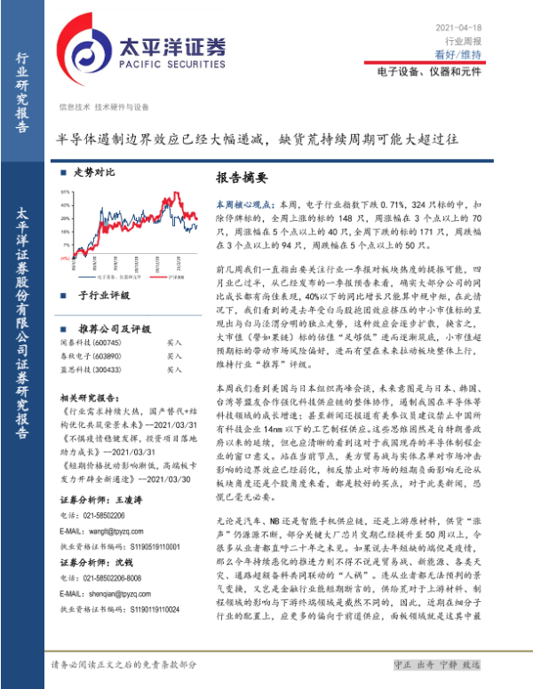 【太平洋证券】【20210418】20210418-太平洋-电子设备、仪器和元件行业周报:半导体遏制边界效应已经大幅递减,缺货荒持续周期可能大超过往-14页