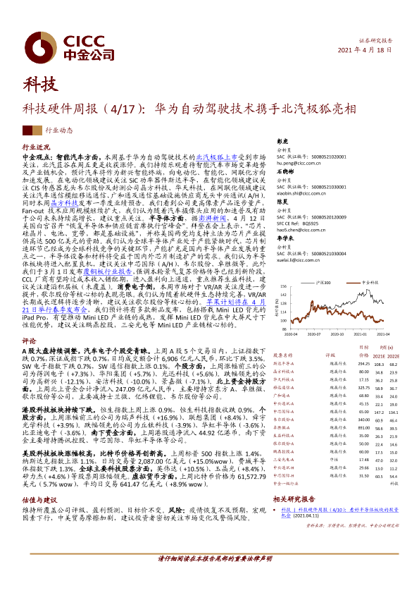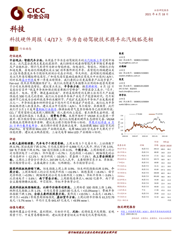 【中金公司】【20210418】科技硬件周报:华为自动驾驶技术携手北汽极狐亮相-13页