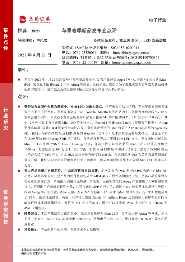 【东莞证券】【20210421】电子行业:苹果春季新品发布会点评:多款新品发布,重点关注Mini LED创新进展-2页
