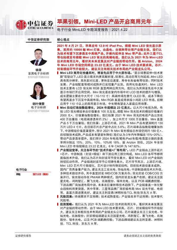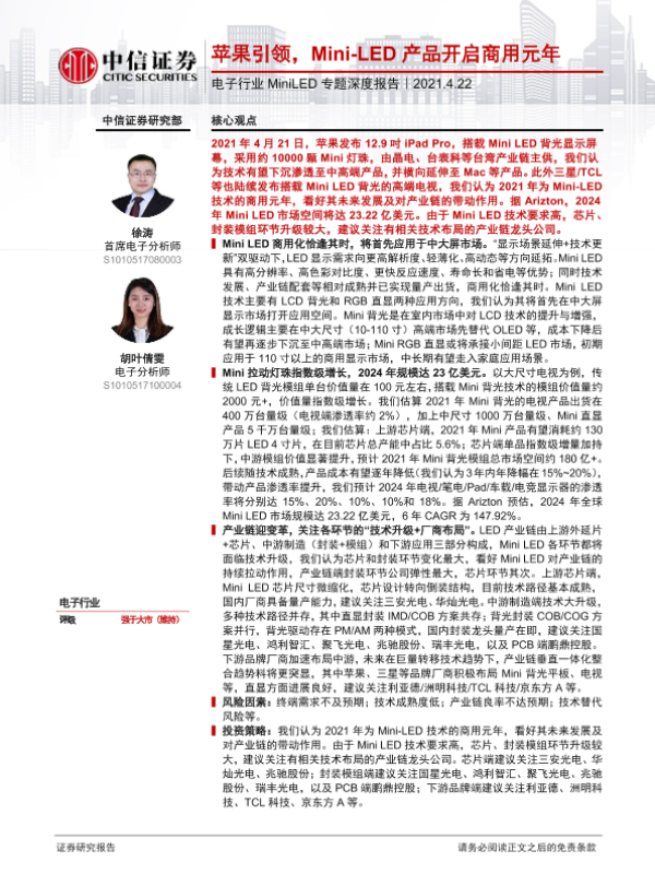【中信证券】【20210422】电子行业MiniLED专题深度报告:苹果引领,Mini-LED产品开启商用元年-27页