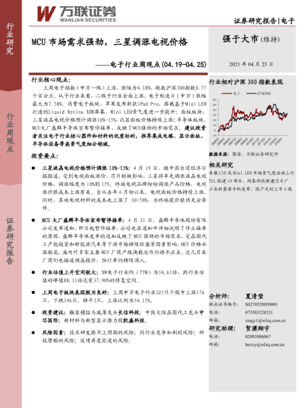 【万联证券】【20210423】MCU市场需求强劲,三星调涨电视价格-13页