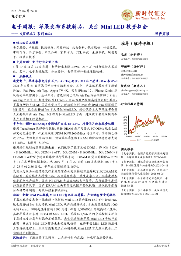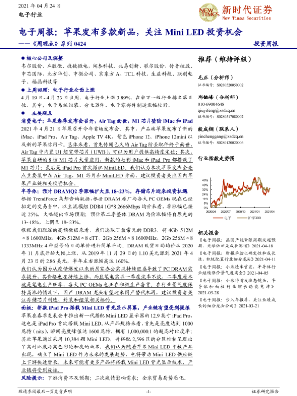 【新时代证券】【20210424】电子周报:苹果发布多款新品,关注Mini LED投资机会——《周观点》系列-21页