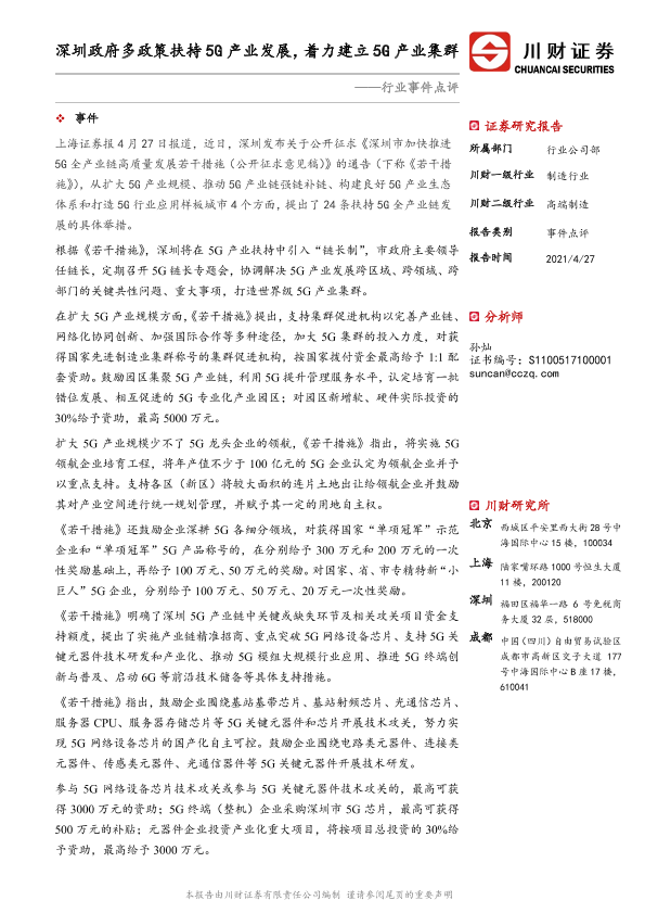 【川财证券】【20210427】制造行业行业事件点评:深圳政府多政策扶持5G产业发展,着力建立5G产业集群-4页