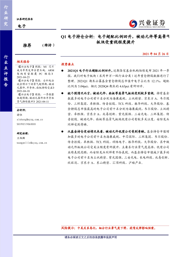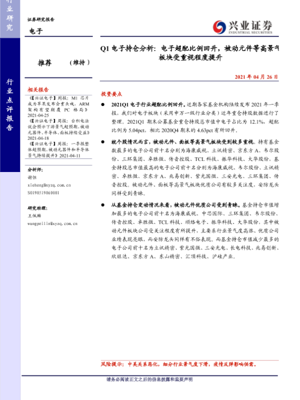 【兴业证券】【20210426】Q1电子持仓分析:电子超配比例回升,被动元件等高景气板块受重视程度提升-5页