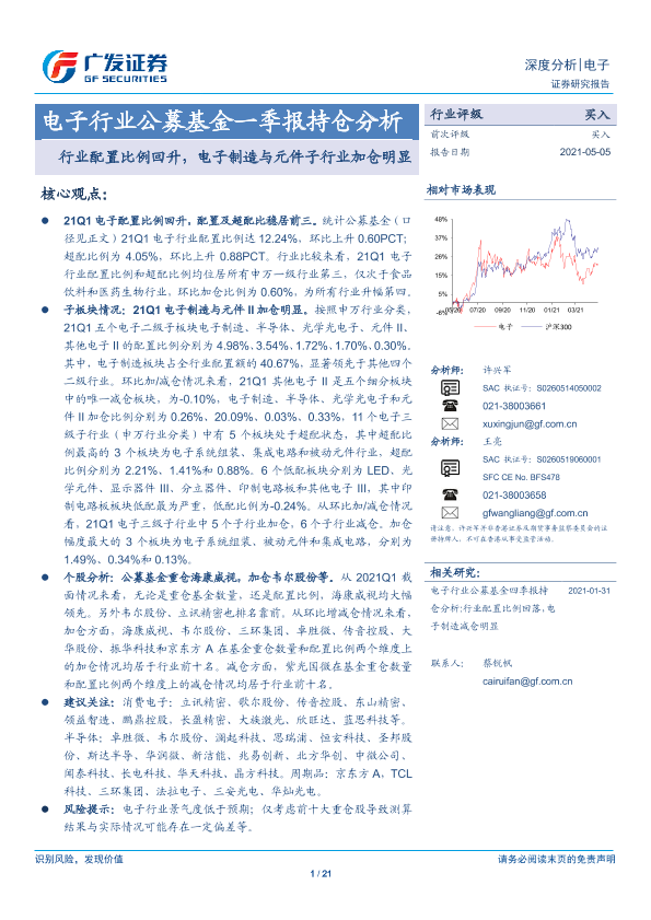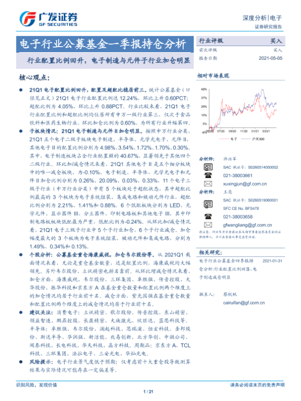 【广发证券】【20210505】电子行业公募基金一季报持仓分析:行业配置比例回升,电子制造与元件子行业加仓明显-21页