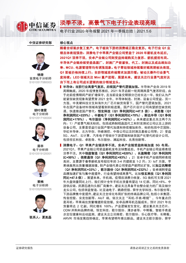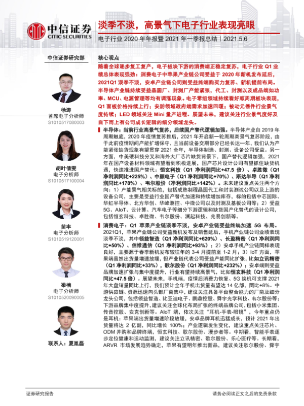 【中信证券】【20210506】电子行业2020年年报暨2021年一季报总结:淡季不淡,高景气下电子行业表现亮眼-16页