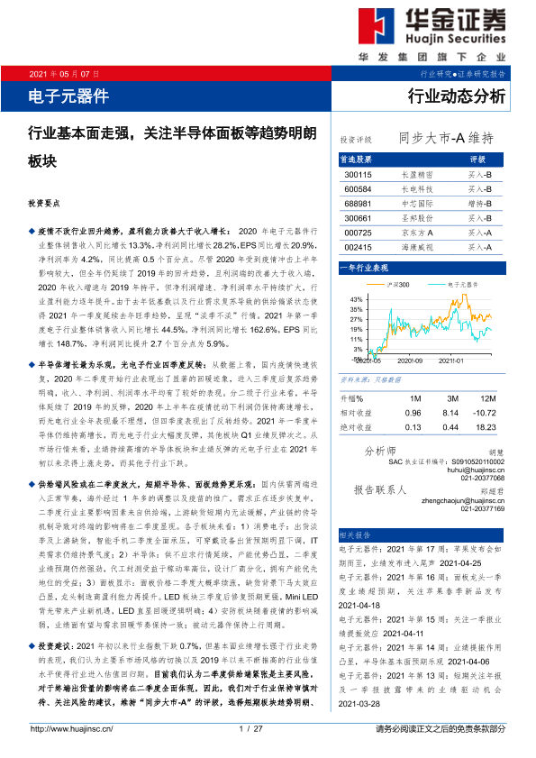 【华金证券】【20210507】电子元器件行业动态分析:行业基本面走强,关注半导体面板等趋势明朗板块-27页