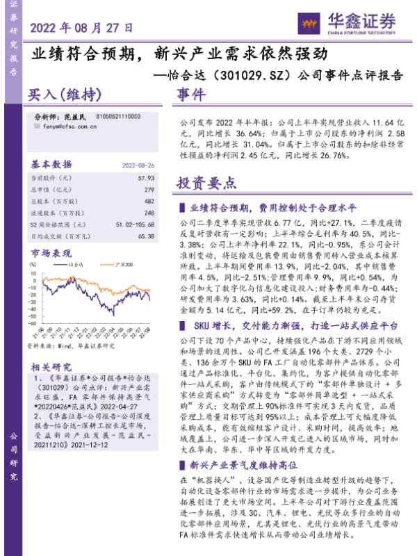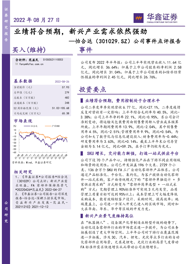 【华鑫证券】【20220827】怡合达-301029-公司事件点评报告:业绩符合预期,新兴产业需求依然强劲-5页