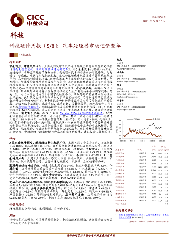 【中金公司】【20210510】科技硬件周报:汽车处理器市场迎新变革-13页