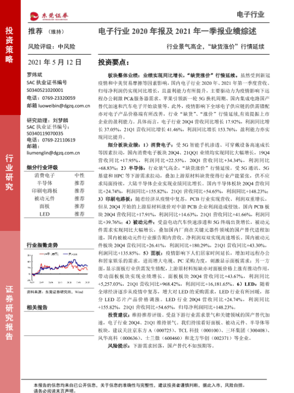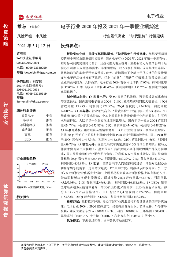【东莞证券】【20210512】电子行业2020年报及2021年一季报业绩综述:行业景气高企,“缺货涨价”行情延续-18页