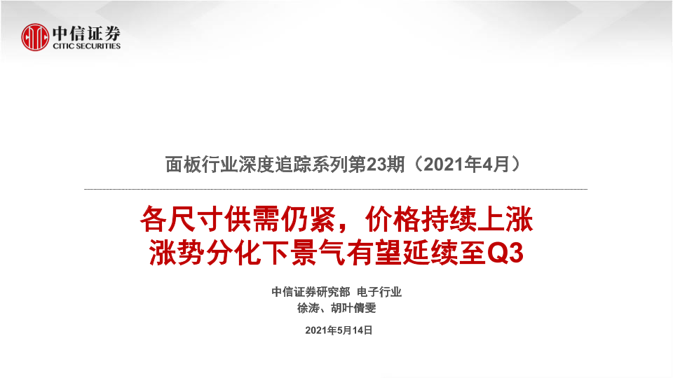 【中信证券】【20210514】面板行业深度追踪系列第23期(2021年4月):各尺寸供需仍紧,价格持续上涨 涨势分化下景气有望延续至Q3-23页