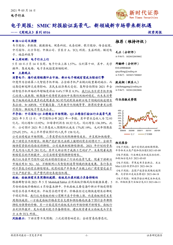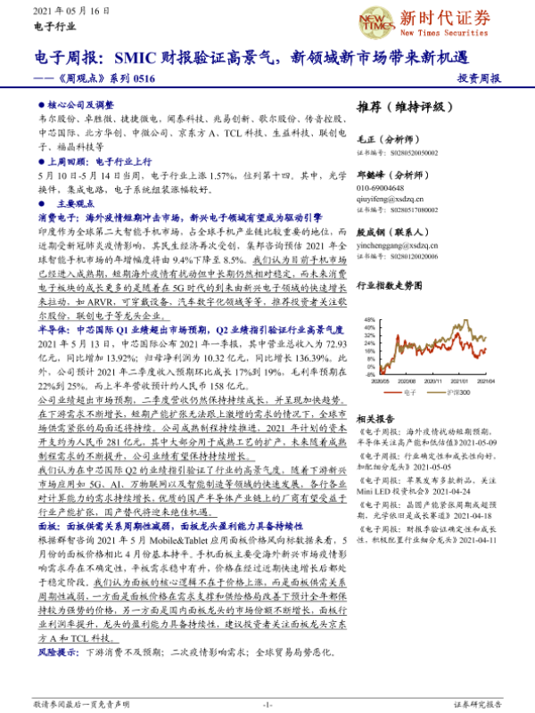 【新时代证券】【20210516】电子周报:SMIC财报验证高景气,新领域新市场带来新机遇-21页