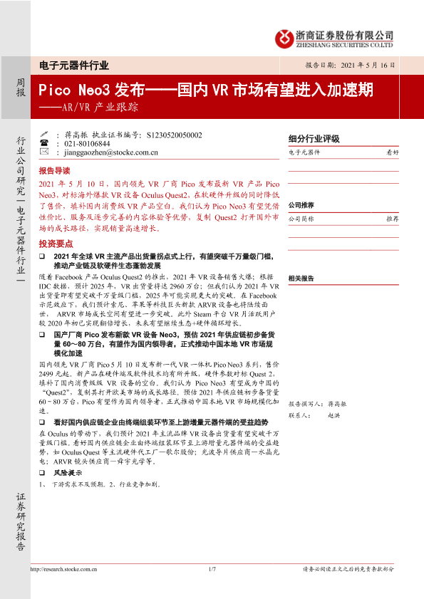 【浙商证券】【20210516】20210516-浙商证券-电子元器件行业:Pico Neo3发布——国内VR市场有望进入加速期──AR VR产业跟踪-7页