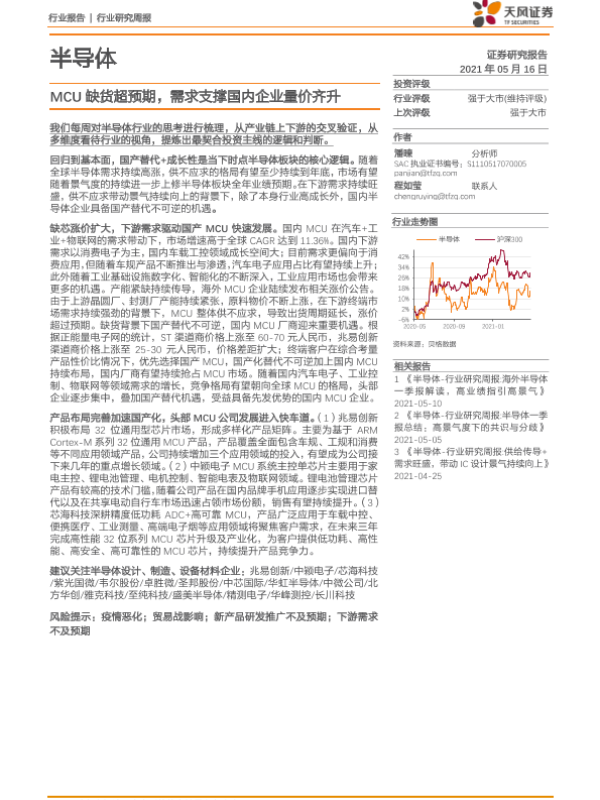 【天风证券】【20210516】半导体:MCU 缺货超预期,需求支撑国内企业量价齐升-9页