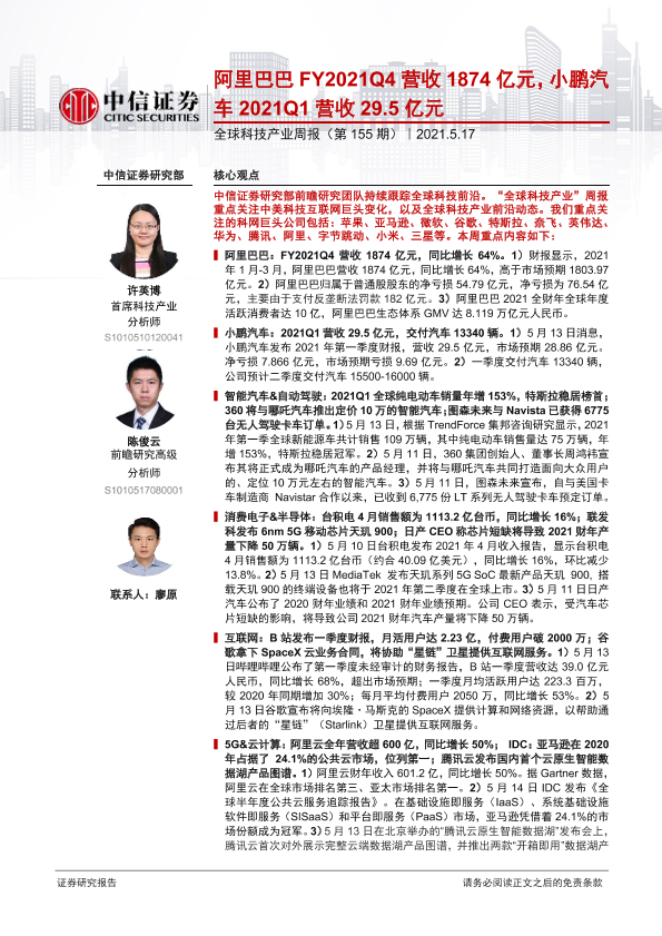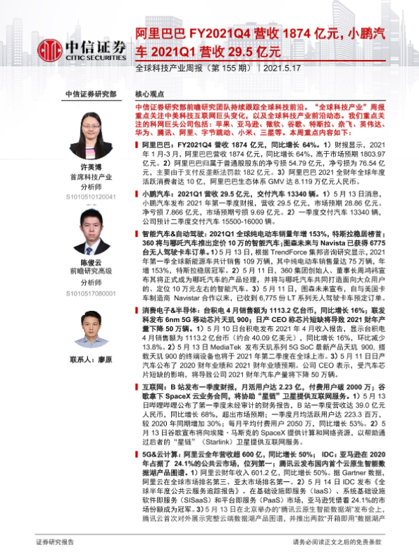 【中信证券】【20210517】全球科技产业周报(第155期):阿里巴巴FY2021Q4营收1874亿元,小鹏汽车2021Q1营收29.5亿元-16页