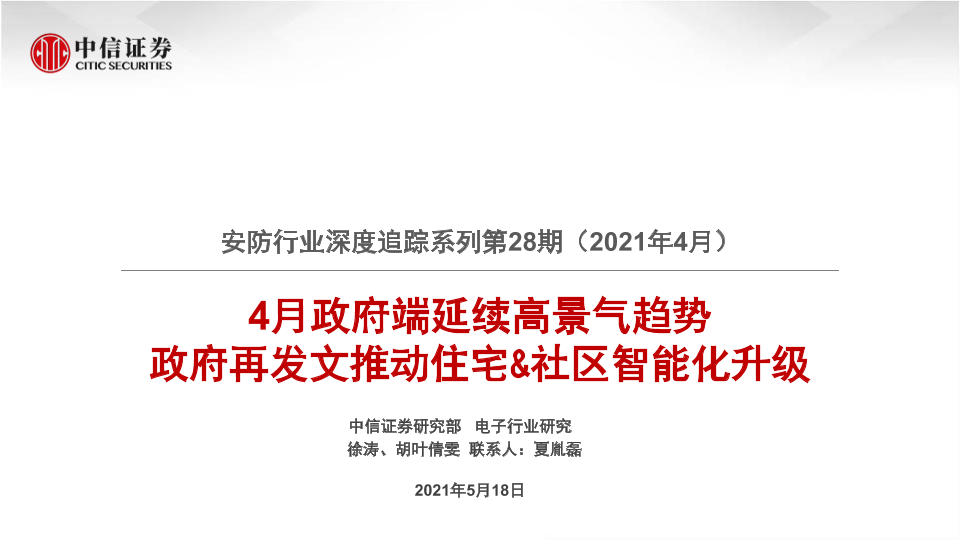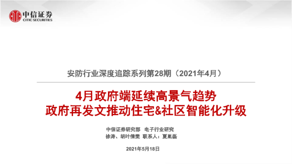 【中信证券】【20210518】20210518-中信证券-安防行业深度追踪系列第28期(2021年4月):4月政府端延续高景气趋势 政府再发文推动住宅&社区智能化升级-19页