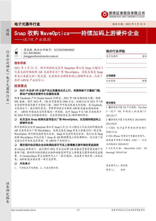 【浙商证券】【20210523】AR VR产业跟踪:Snap收购WaveOptics——持续加码上游硬件企业-8页