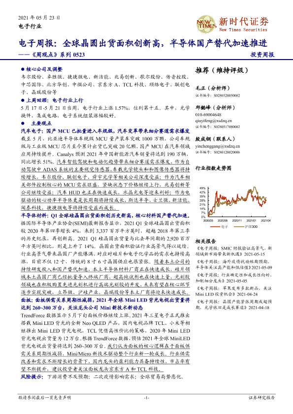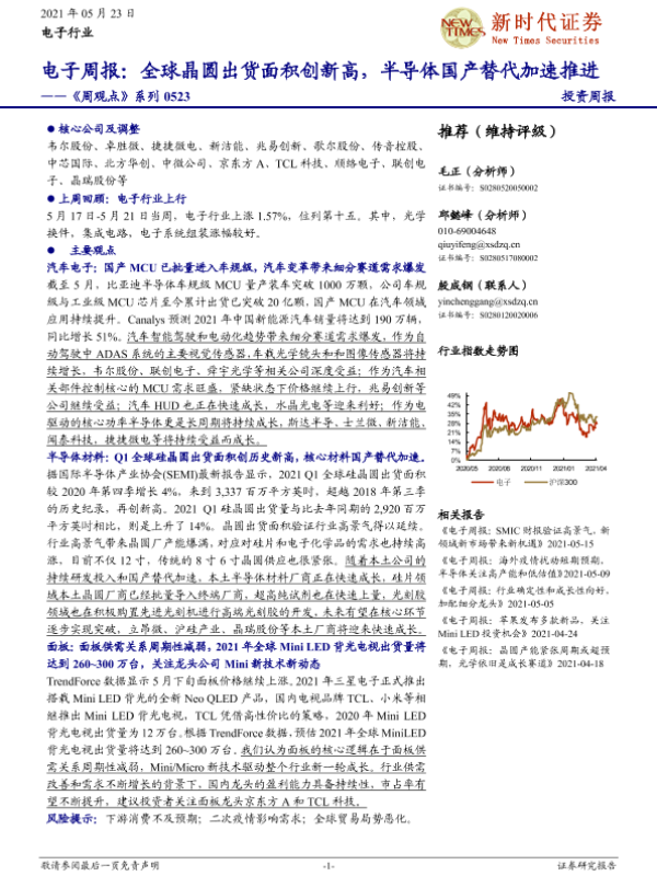 【新时代证券】【20210523】20210523-新时代证券-电子行业《周观点》系列:全球晶圆出货面积创新高,半导体国产替代加速推进-21页