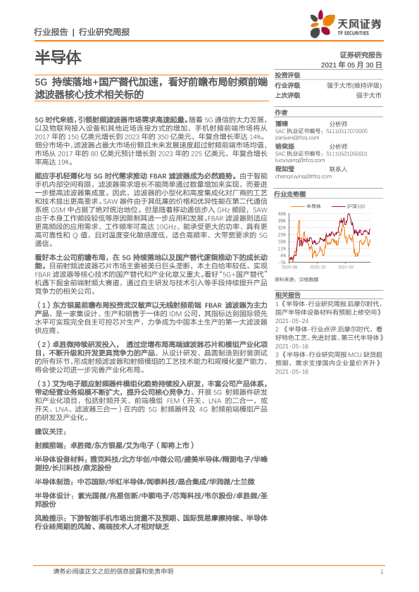 【天风证券】【20210530】20210530-天风证券-半导体行业研究周报:5G持续落地+国产替代加速,看好前瞻布局射频前端滤波器核心技术相关标的-7页