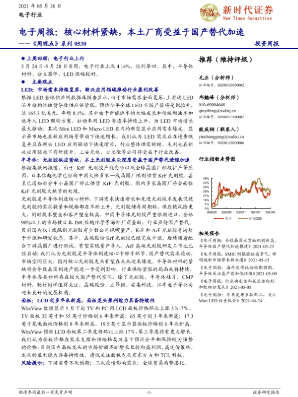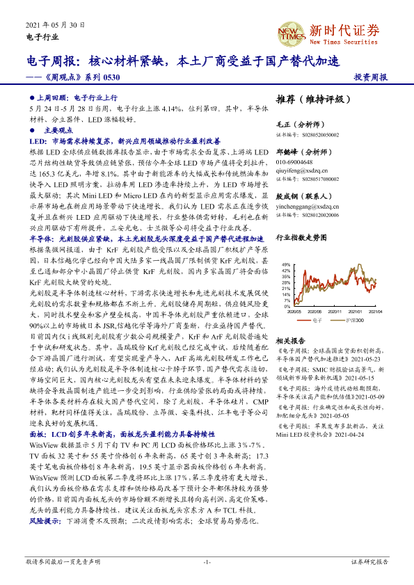 【新时代证券】【20210530】20210530-新时代证券-电子周报:核心材料紧缺,本土厂商受益于国产替代加速-20页