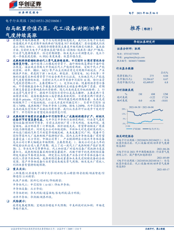【华创证券】【20210606】20210606-华创证券-电子行业周报:白马配置价值凸显,代工 设备 封测 功率景气度持续高涨-20页