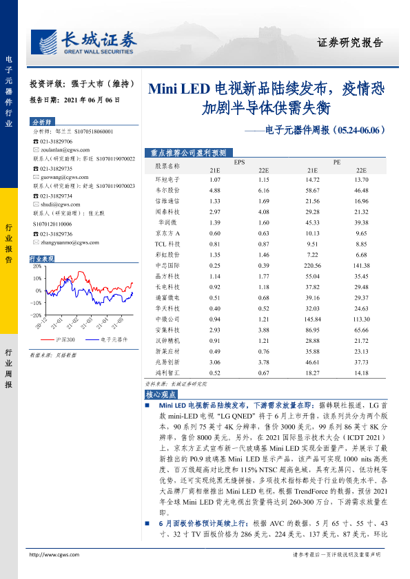 【长城证券】【20210606】20210606-长城证券-电子元器件周报:Mini LED电视新品陆续发布,疫情恐加剧半导体供需失衡-21页