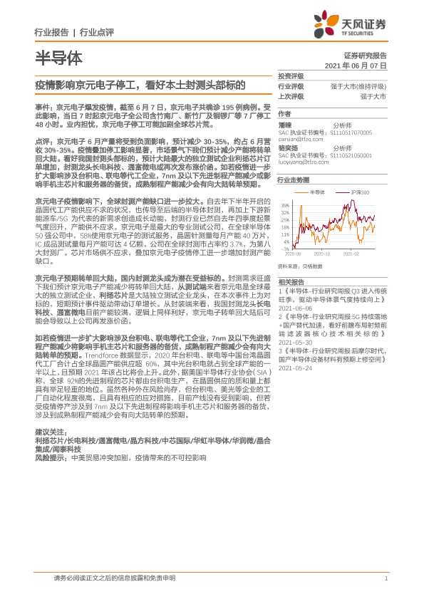 【天风证券】【20210607】半导体行业点评:疫情影响京元电子停工,看好本土封测头部标的-3页