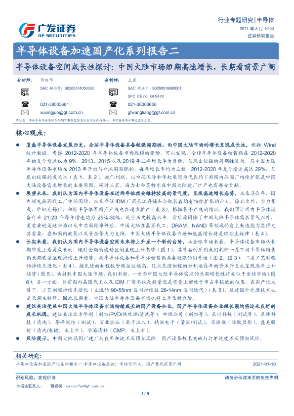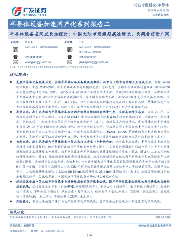 【广发证券】【20210610】半导体设备空间成长性探讨:中国大陆市场短期高速增长,长期看前景广阔-9页