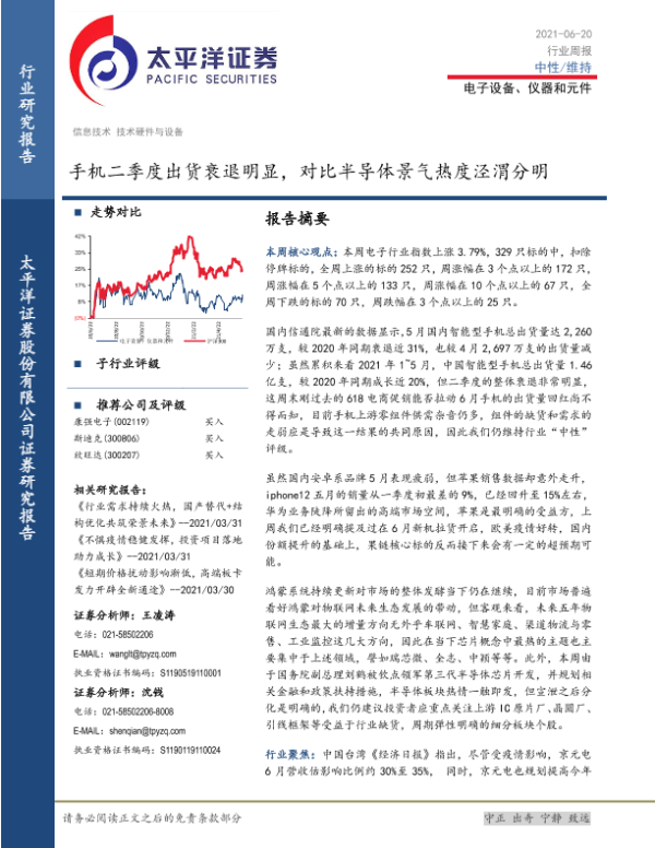 【太平洋证券】【20210620】20210620-太平洋-电子设备、仪器和元件行业周报:手机二季度出货衰退明显,对比半导体景气热度泾渭分明-14页