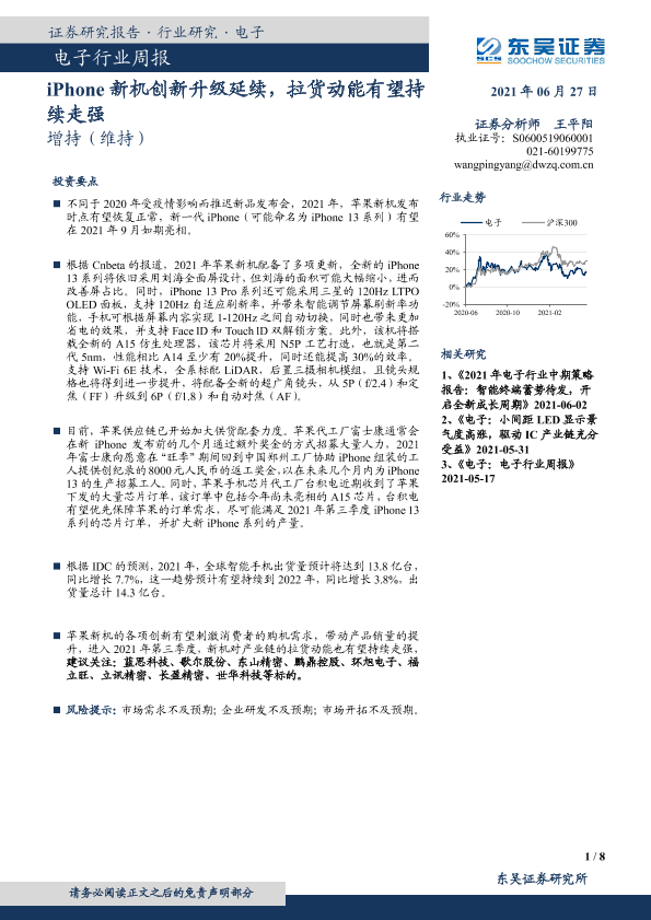 【东吴证券】【20210627】20210627-东吴证券-电子行业周报:iPhone新机创新升级延续,拉货动能有望持续走强-8页