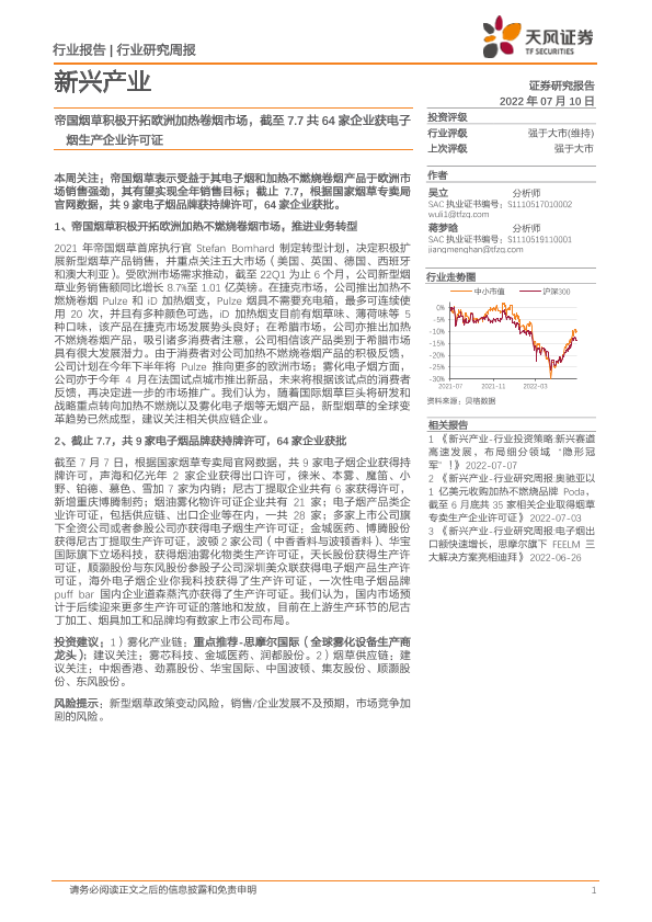 【天风证券】【20220710】新兴产业研究周报:帝国烟草积极开拓欧洲加热卷烟市场-4页