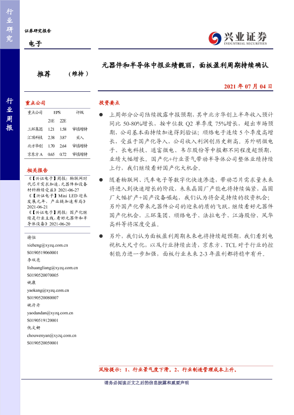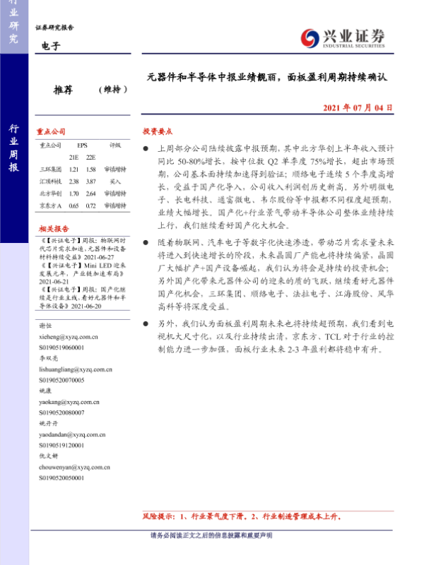 【兴业证券】【20210704】电子行业周报:元器件和半导体中报业绩靓丽,面板盈利周期持续确认-8页