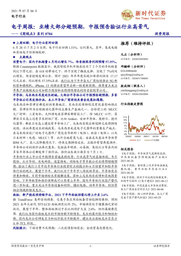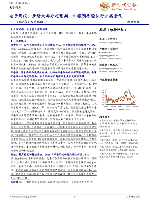 【新时代证券】【20210704】20210704-新时代证券-电子行业《周观点》系列:业绩大部分超预期,中报预告验证行业高景气-16页