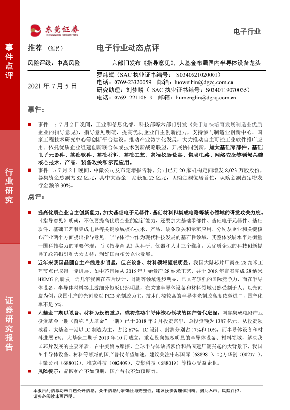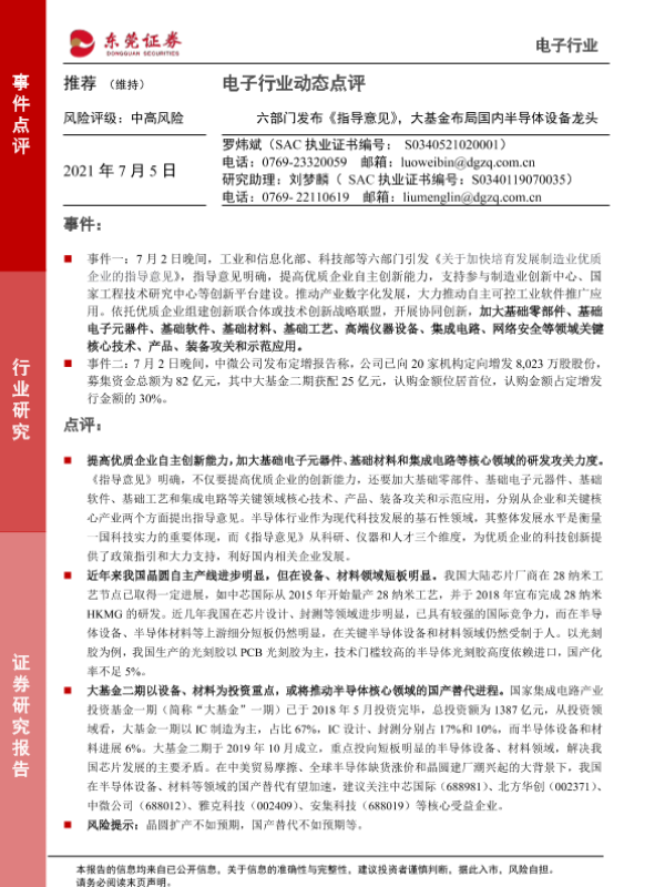 【东莞证券】【20210705】电子行业动态点评:六部门发布《指导意见》,大基金布局国内半导体设备龙头-2页