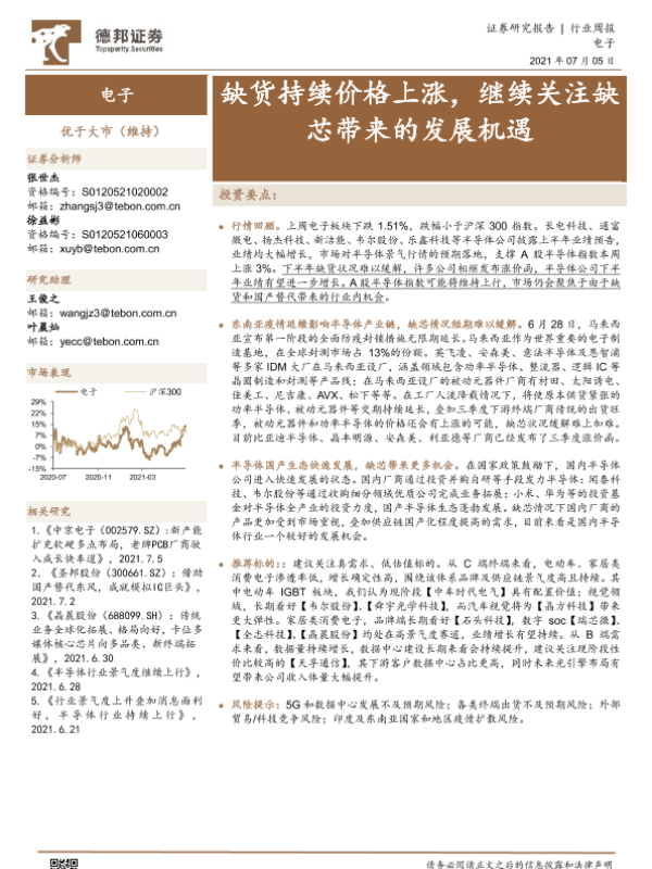 【德邦证券】【20210705】电子行业周报:缺货持续价格上涨,继续关注缺芯带来的发展机遇-13页