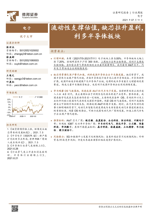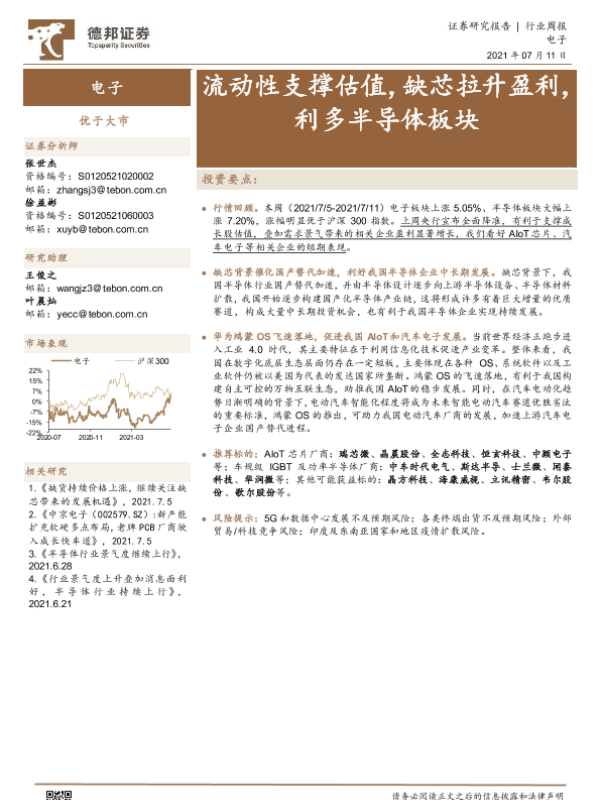 【德邦证券】【20210711】20210711-德邦证券-电子行业周报:流动性支撑估值,缺芯拉升盈利,利多半导体板块-13页