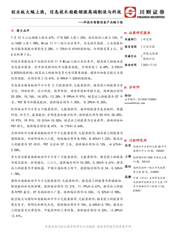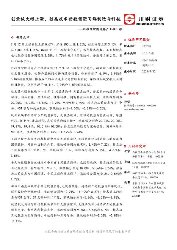 【川财证券】【20210712】科技及智能设备产业链日报:创业板大幅上涨,信息技术指数领涨-3页